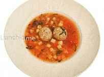 бульон мясной, мясные говяжьи фрикадельки с рисом, яйцо куриное, томатная паста