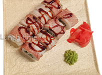 бекон, нори, рис, сыр Филадельфия, огурцы, соус Унаги, соевый соус