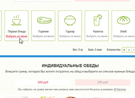 - Ваше желание создать полностью индивидуальный комплексный обед мы тоже предусмотрели. Нужно лишь задать предпочтительную стоимость набора и добавить блюда в состав обеда. Когда вы превысите указанную стоимость, в специальном окошке в рядом с формой выбора мы проинформируем вас об этом